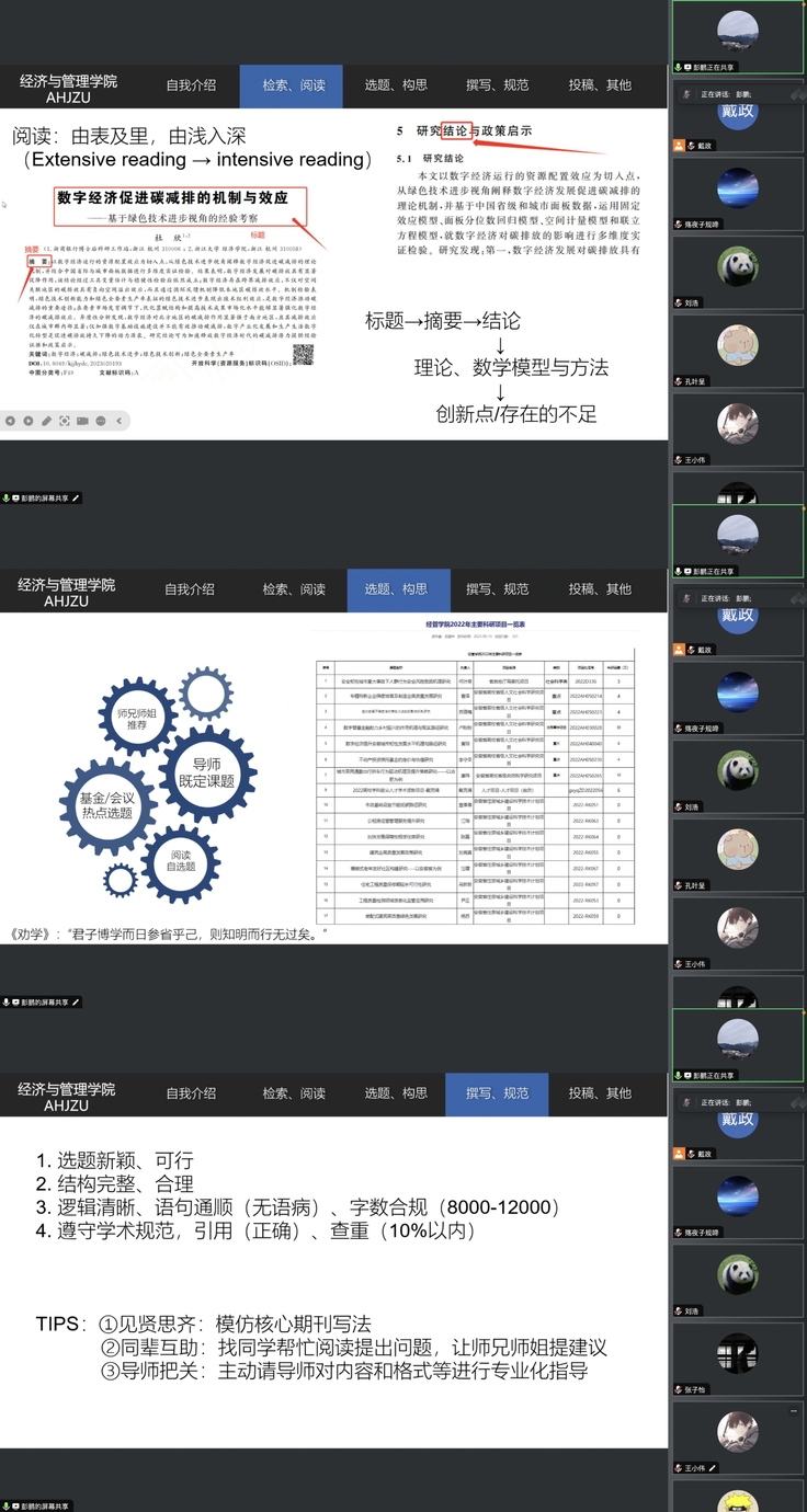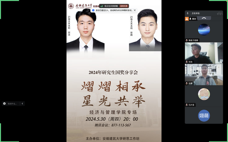 熠熠相承,星光共举。近日,研工部在线上开展2024年第2期国奖经验交流分享会。本期讲座邀请了我校经济与管理学院位获得国家奖学金的研究生分享国奖经验。