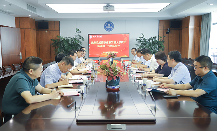本网讯 7月18日,南京信息工程大学党委副书记、校长陈海山,校党委常委、副校长刘佳带队来校考察交流。我校党委副书记、校长蔡国军主持座谈交流会,校党委常委、副校长杨科及学校办公室、统战部、教务处、研究生院、科技处、科技成果转化处等相关单位负责人参加座谈。