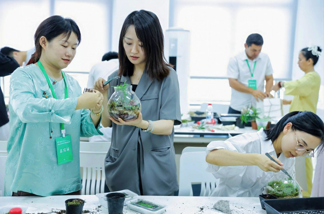 由我校建规学院景观系谢昕云博士主持的“方寸呼吸·植语成诗-苔言童境工坊”,通过参与者亲手设计与制作桌面微景观,探索微景观中隐藏的情感密码与无意识投射,感受微观生命的蓬勃张力,吸引了大量参会者亲手体验。