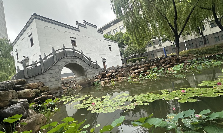 此外,在岸边平台增设石凳石桌,打造可供师生休憩、观景、交流的亲水空间,为师生提供舒适的户外学习与社交场所。目前,湖内水生植物生长良好,清澈的水面倒映着光启堂的建筑轮廓,曾经的淤塞水域已转变为景观区域,与即将启用的光启堂共同构成融合人文与自然的校园新场景。