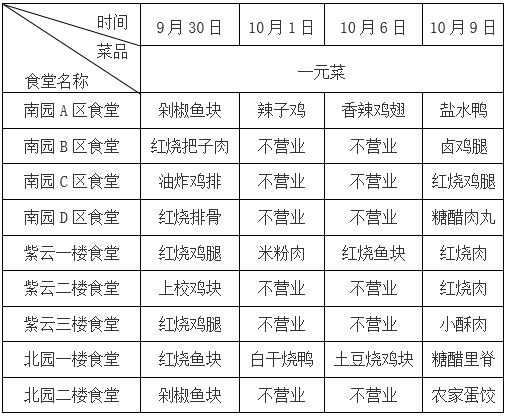 各位师生: 为保障国庆、中秋期间师生就餐需求,同时营造节日氛围,现将食堂营业调整及让利优惠活动相关事宜通知如下: 一、营业调整:紫云路校区南园A区食堂、紫云一楼食堂,金寨路校区北园一楼食堂放假期间正常营业,其余食堂停止营业,10月8日中餐起所有食堂恢复营业;两个校区教工餐厅放假期间停止营业,10月9日起恢复营业。 二、让利优惠活动:各食堂在活动期间每天中餐推出一道全荤菜1元供应,同时中秋节(10月6日)全天,到食堂就餐人员可免费领取月饼一枚。 后勤管理处 2025年9月26日
