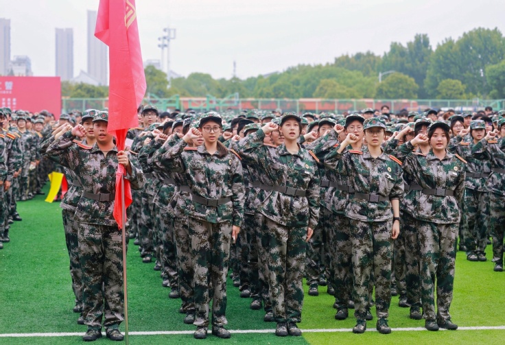 蔡国军一声令下,军训成果展示正式拉开帷幕。首先亮相的是拼字方阵,学员们以精准的跑位、默契的配合,诠释了对祖国的赤诚热爱和对学校精神的领悟;行进间队列方阵表演中,同学们步伐铿锵有力,动作整齐划一,彰显出严格的纪律性和高度的协同精神;战术方阵的演示将现场气氛推向高潮,学员们模拟战场环境,灵活施展战术动作,彰显了过硬的军事素养;刺杀操方阵的同学们口号如雷,突刺凌厉迅猛,动作刚劲有力,尽显一往无前的战斗作风;匕首操方阵的女同学们手持训练匕首,动作干净利落,喊杀声清脆响亮,巾帼不让须眉的英姿成为操场上一道亮丽的风景;格斗术方阵的学员们身手敏捷,展现了扎实的防身自卫能力和勇毅顽强的意志。最后,全体参训学员以一场气势磅礴的大合唱为成果展示画上圆满句号。