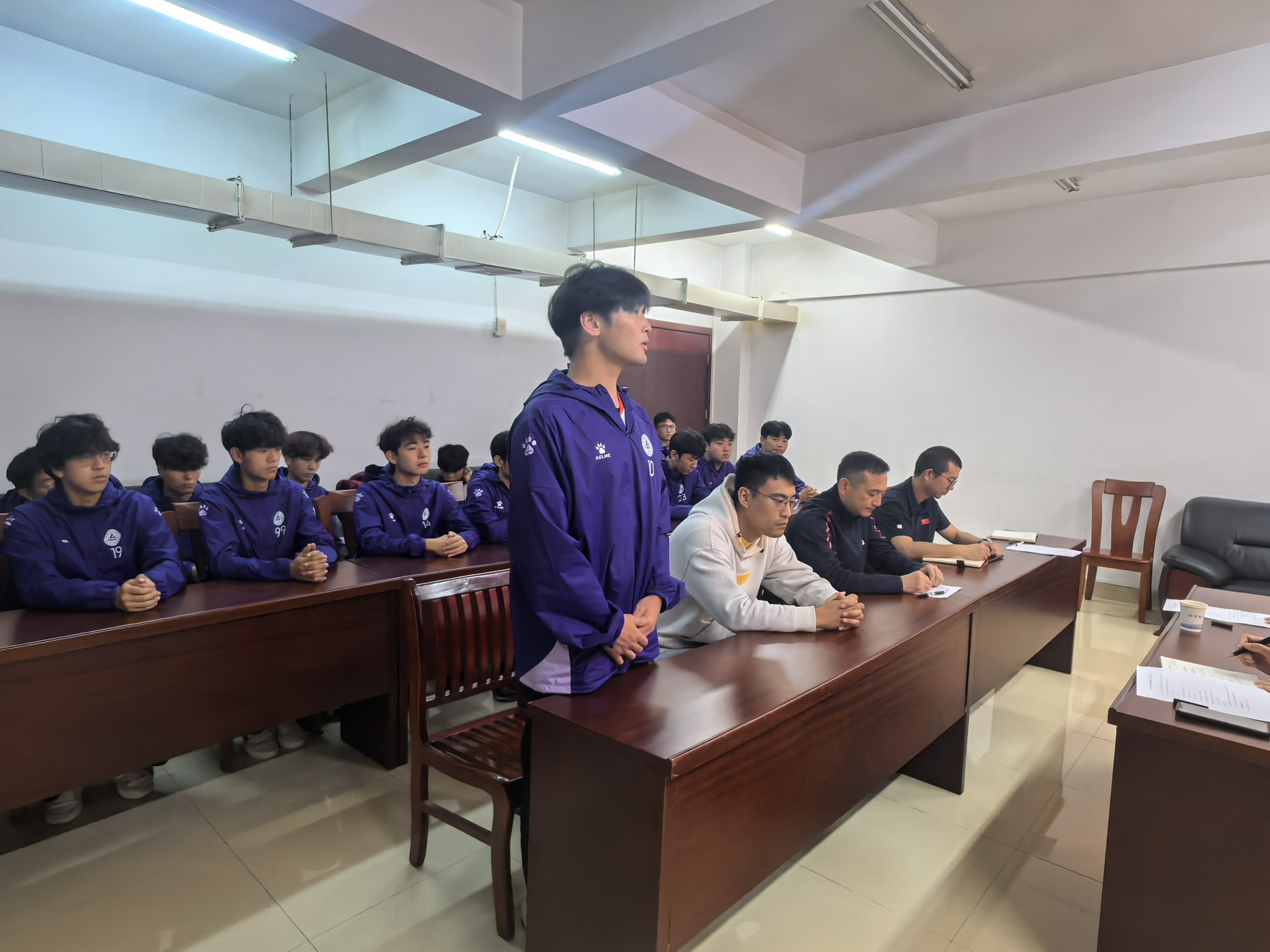 动员会上,校男足主教练陈华老师就“徽青赛”前期备赛情况进行汇报,详细介绍了体能储备、基础训练、战术体系构建和实战检验等方面情况,并明确了下一阶段的训练计划。从强化专项能力、深化战术执行与临场应变、注重身心调整与团队凝聚等方面重点推进,为后续备战比赛锚定清晰方向。随后,校男足队长杨由甲同学代表全体队员作表态发言,他表示全队已做好充分准备,将以昂扬斗志、明确目标投入训练与比赛,全力争取优异成绩。